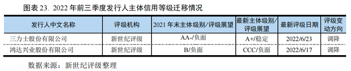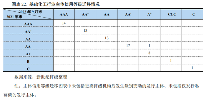 2022年前三季度,除去5家新评级发行主体,基础化工行业仅有2家发行主体发生了信用等级迁移事件,全部为向下迁移级别。