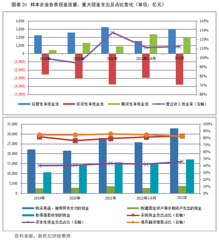 样本企业的主要现金流出为采购环节的现金支出。2022年前三季度购买商品、接受劳务支出的现金为2,5815.25亿元,同比增长23.04%,其中采购现金支出占经营性现金流出量的81.32%。同期,样本企业的资本性支出保持增长,但增速放缓,2022年前三季度购建固定资产等长期资产支出的现金为2,641.03亿元,同比增长5.35%,占投资性现金流出量的42.11%,行业其余投资性现金开支项目主要为股权投资、理财支出等。受债务集中到期影响,2022年以来样本企业偿还债务支出金额为12,151.22亿元,同比增长5.15%;分配股利、利润和偿还利息所支付的现金为1,208.87亿元,同比增长20.31%。2022年前三季度筹资性现金流净额为2,380.79亿元,同比大幅增长86.21%。