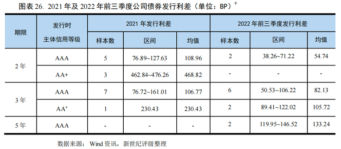 2021年行业内企业共发行16支一般公司债券,2年期和3年期AAA级主体发行的公司债券利差均值分别为108.96BP和106.77BP;2年期AA+主体发行的公司债券利差较大,为恒逸集团发行的三期2+1年期公司债券。2022年前三季度共发行12支一般公司债券,主体信用等级以AAA级居多,2年期、3年期和5年期AAA级发行主体发行的公司债券利差均值分别为54.74BP、82.13BP和133.24BP。