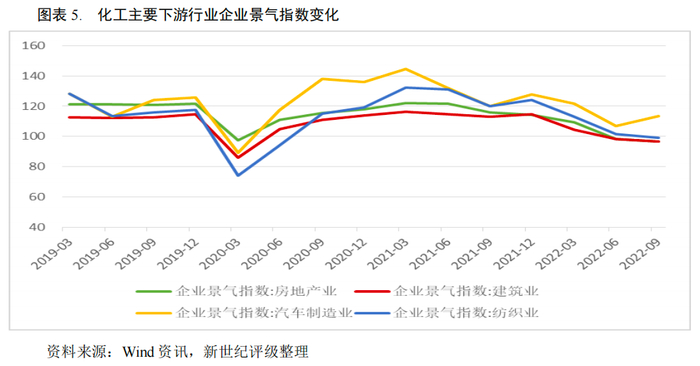 化工行业下游需求分布广泛,主要包括房地产业、建材行业、家用电器、汽车业和纺织业等,2022年1-10月下游行业景气度指数整体走低。房地产方面, 2022年1-10月,我国房地产开发投资11.39万亿元,同比下降8.80%,房地产施工、竣工、新开工面积同比均大幅下降,地产市场需求持续萎靡;家用电器方面, 2022 年 1-11 月,空调、家用电冰箱、冷柜、家用洗衣机产量累计同比增速分别为 2.0%、-3.7%、-22.4%和 4.5%,较上年均有所回落;2022 年汽车市场在燃油车购置税减半及新能源车补贴政策的利好下有所回暖,1-10 月汽车产量为 2,222.86 万辆,同比增长 8.09%,销量同比增长 4.60%,对橡胶、炭黑及汽车相关新材料需求有所拉动,但对整体需求贡献较为有限;纺织行业方面,受国内疫情反复、消费降级等因素影响,纺织品服装内外市场需求减弱,2022 年 1-11 月国内织布产量累计同比下滑 6.1%,纱线产量累计同比下降 6.9%。2023年我国经济在防疫政策优化之后有望逐步复苏,带动消费需求回暖,房地产调控政策的放松预计将对地产相关化工品的需求有一定提振,传统行业化工品需求有望逐步修复;新能源汽车、光伏、风电等清洁能源领域、军工相关上游的化工材料、半导体材料等中高端化工新材料需求有望延续高景气度。