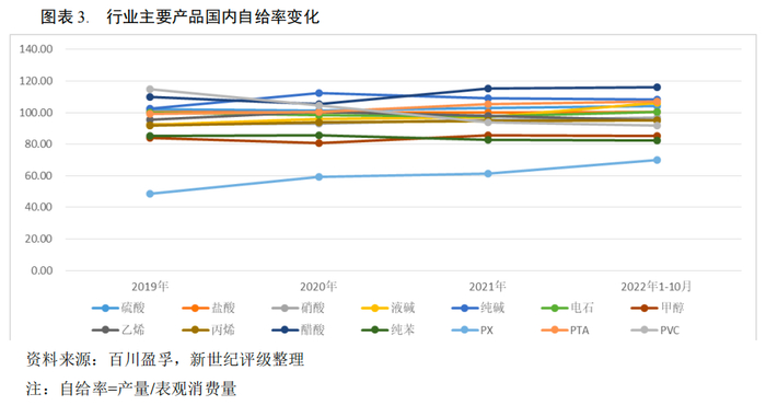 从供需关系来看,行业内主要化工品的国内自给率普遍很高,同质化竞争压力大。2022年1-10月,硫酸、盐酸、液碱、纯碱、电石自给率超过100%,硝酸自给率较上年提升1.46个百分点至96.92%。有机类产品中醋酸、PTA自给率超过的100%,乙烯和丙烯自给率约95%,PVC自给率下降1.80个百分点至91.84%,甲醇、纯苯、PX和合成橡胶自给率相对较低,仍面临供给不足的问题,其中PX自给率提升8.54个百分点至69.86%,进口依赖度持续下降。当前多数化工品仍面临不同程度的供给过剩压力,有赖于供给侧改革、环保治理的持续推进,来进一步缓解供给过剩压力,尤其是高能耗高污染类化工品。进口依赖较高的高端有机化学品更多集中于化工新材领域,有赖于基础材料研发投入、装置与工艺水平等整体提升来加以缓解。