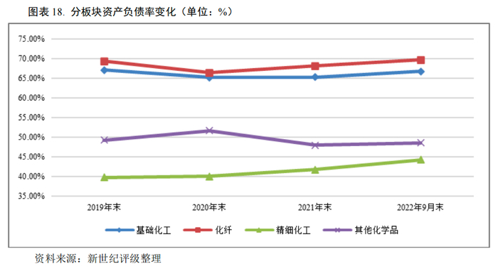分板块来看,基础化工和化纤板块财务杠杆水平明显高于精细化工和其他化学品板块。截至2022年9月末,基础化工、化纤、精细化工、其他化学品样本企业平均资产负债率分别为66.82%、69.74%、44.32%和48.60%,分别较上年末上升1.48、1.66、2.53和0.60个百分点,精细化工板块资产负债率增幅最大。从带息债务增量来看,2022年9月末精细化工板块带息债务较上年末增幅最大,为35.49%,基础化工和化纤带息债务分别较上年末增长15.23%和18.63%。