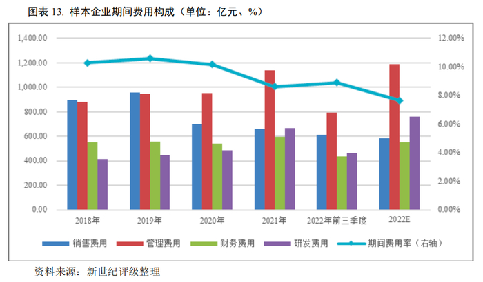 2022年前三季度,样本企业期间费用总规模为2,323.58亿元,同比变化不大,其中销售费用和财务费用分别同比减少13.02%和9.50%,管理费用和研发费用分别同比增长6.31%和19.69%。从构成看,2022年前三季度管理费用、研发费用、销售费用和财务费用占比分别为36.21%、23.93%、22.87%和16.99%;由于当期营业收入增长,期间费用率较上年同期下降1.32个百分点至7.59%。预计样本企业的2022年(E)期间费用合计3,085.35亿元,相应的期间费用率为7.66%。