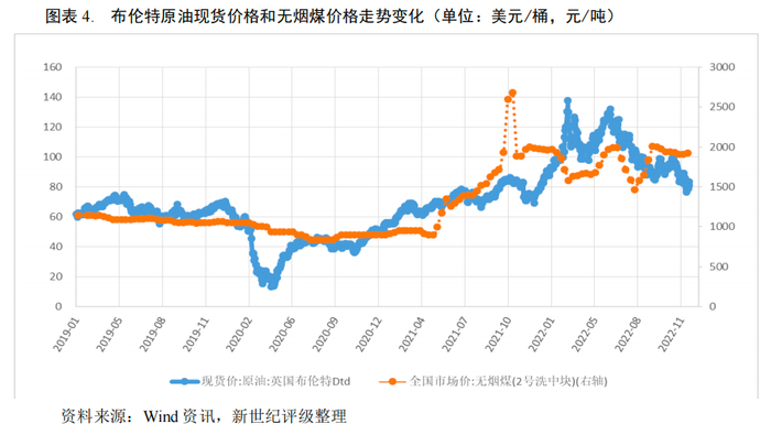 2022年上半年受俄乌冲突影响,俄罗斯原油产量下降,市场供应趋紧,国际油价呈大幅上涨走势,截至6月末布伦特原油价格较上年末上涨52.18%至120.54美元/桶;下半年美国通胀数据上升和多次加息以及中国市场的需求萎靡使得全球经济衰退预期升温,原油价格转而持续下跌 ,截至12月12日布伦特原油价格为83.63美元/桶,较6月末下降34.64%。煤炭价格方面,2022年随着国内煤炭保供增量政策的执行,煤炭价格逐步回归理性,但仍受市场供需变化和疫情影响呈现较大波动
