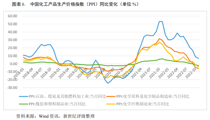 2022年上半年,主要受俄乌冲突引发的全球能源危机,石油、天然气等能源价格高企带动化工产品价格上涨,化工产品价格指数(CCPI)于6月10日达到高点6,243点,较年初上涨20.36%;下半年受能源价格下跌、下游需求不振影响,CCPI逐步回落,截至12月13日降至4,818点。2022年上半年化工行业PPI同比增速仍处于中高位水平,但下半年呈大幅下滑态势,其中10月和11月化学原料及化学制品、塑料与橡胶制品和化学纤维行业的PPI同比下降。上下游对比来看,上游石油、煤炭及其他燃料加工业PPI同比增速高于中游化工原料及化学制品制造业高于下游塑料与橡胶制品业和化学纤维制造业,主要系能源价格上涨对上游化工原料的价格支撑较强,而下游行业由于终端需求减弱,供需失衡,价格下行压力加大。