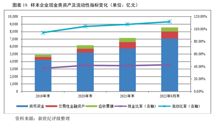 样本企业现金类资产的构成主要为货币资金、应收票据、应收款项融资和交易性金融资产,2022年9月末样本现金类资产总计9,556.24亿元,较上年末增长17.17%,其中货币资金增幅尤为显著。截至2022年9月末,样本企业货币资金余额达7,063.11亿元,较上年末增长22.55%,占现金类资产的73.91%;应收票据及应收款项融资合计1,535.19亿元,较上年末减少1.00%;交易性金融资产为957.93亿元,较上年末增长13.85%。2022年9月末,样本企业现金比率较上年末上升1.62个百分点至43.05%。