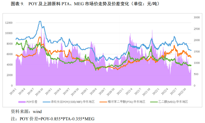 化纤产业链方面,2022年涤纶长丝价格呈先涨后跌,上半年价格上涨主要系成本驱动,6月末POY150D市场均价较年初上涨17.48%;而需求端持续低迷,对涤纶长丝价格形成拖累,三季度以来油价下跌,成本端支撑减弱,涤纶长丝价格随之下行,截至11月末,POY产品市场均价较6月末下降19.64%至6,750元/吨。PTA价格走势与POY相似,但上半年价格涨幅(35.11%)高于POY,下半年跌幅(18.39%)小于POY;MEG因产能扩张、下游需求不振导致供需失衡影响下降影响,全年价格波动下行。价差方面,由于POY价格涨幅小于原材料涨幅,2022 年上半年国内 POY平均价差为1,072元/吨,同比约下降32%;7、8月份,随着PTA、MEG价格逐步下行,涤纶长丝产品价差有所回升;9月和10月由于需求不及预期价差又呈回落态势,截至2022年11月末,POY价差约为689元/吨。2022年1-11月,POY平均价差为1,050元/吨,较上年下降30.21%,总体来看,2022年POY价差低位运行,对涤纶长丝生产企业盈利带来较大冲击。