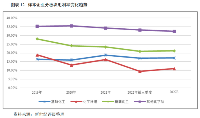 从细分板块毛利率水平来看,其他化学品行业盈利能力最强;精细化工行业产品附加值较高,盈利水平较好;基础化工和化纤行业毛利率水平相对较低。从变化趋势上来看,2022年前三季度四大板块毛利率均有所下滑,其中化纤样本企业毛利率同比下降6.31个百分点,降幅最大;基础化工原料、精细化工和其他化学品样本企业毛利率分别同比下2.25、3.06和2.94个百分点。同期,除基础化工样本企业营业毛利同比实现小幅增长之外,产业链位置偏下游的化纤、精细化工和其他化学品样本企业营业毛利均同比下滑9%左右。