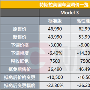 在美国市场,特斯拉将Model 3标准版下调3,000美元至43,990美元;Model 3高性能版下调9,000美元至53,990美元;将Model Y五座长续航版下调13,000美元至52,990美元;将Model Y五座高性能版下调13,000美元至56,990美元.