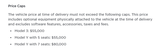 事实上,这个价格上限是按照“轿车”和“SUV”来划分的。轿车的上限是5.5万美元,Model 3和五座的Model Y可享受补贴;而SUV的上限是8万美元,例如七座的Model Y符合补贴条件。