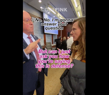 “粉色代码”的推特还发布了当天会后的小插曲。当该组织成员塔比塔·斯彭斯(Tabitha Spence)向美国退役空军中将、米切尔航空航天研究所所长大卫·德普图拉(David Deptula)提问美方为何要加剧危机时,对方扯起了美国宪法宣言,称其中“提供共同防务,促进公共福利”(provide for the common defense, promote the general welfare)是组建美国政府的原因。