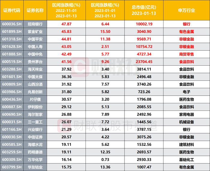 注:此轮反弹行情中涨幅前20股(区间涨幅:2022.11.1-2023.1.13)