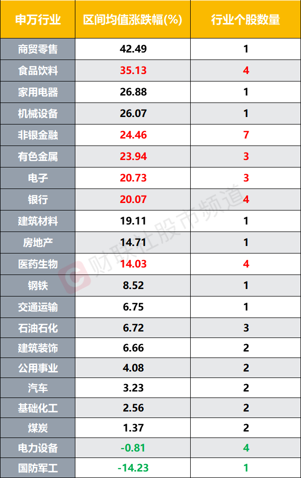 从行业角度来看,除去仅有单股的板块,上证50指数个股分行业平均涨幅榜中,食品饮料概念以35.13%的涨幅位居行业平均涨幅榜第一,非银金融、有色金属、电子、银行股行业平均涨幅也超20%。不过,相较于上述的“优等生”,电力设备行业则表现不佳,4只概念股平均跌近0.81%。此外,若将仅有单股的板块也一同统计,商贸零售板块(中国中免)以42.49%的成绩排名第一,而军工板块则以14.23%的跌幅位居末尾。