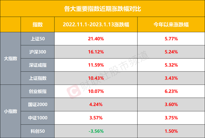 今年以来,A股市场整体表现出色,各大指数重心均持续上移。其中,代表“权重股”的上证50指数大幅拉升,截止今日(1月13日)收盘,其年内上涨近5.8%,同时较之去年11月低点处累计反弹超20%,大幅跑赢其他主流宽基指数。