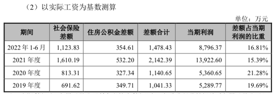 以实际工资测算,报告期内,壹连科技的五险一金差额均在在1000万以上,2022年1-6月的差额为1478万元,占到当期净利润的16.81%,2021年甚至占到21.28%。