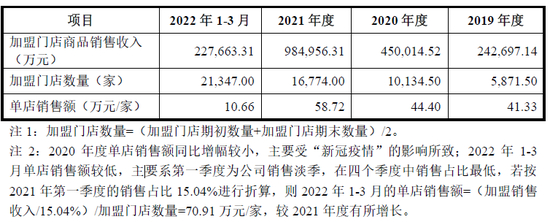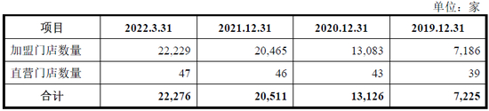 公司采用“直营连锁为引导,加盟连锁为主体”的销售模式。报告期内,公司加盟门店数量增长较快,从而带动主营业务收入的快速增长。截至2022年3月末,公司共有加盟门店22,229家、直营门店47家。