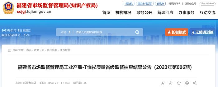 中国质量新闻网讯 2023年1月11日,福建省市场监督管理局网站发布工业产品-T恤衫质量省级监督抽查结果公告(2023年第006期)。