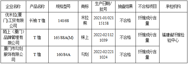 据公告,近期,依据《中华人民共和国产品质量法》和相关产品标准及抽查细则明确项目,福建省市场监督管理局组织对生产企业T恤衫产品质量开展省级监督抽查。本次共抽查60批次,其中3批次不合格,不合格发现率为5%。不合格样品的商标涉及:米拉熊、枺上、勾划。