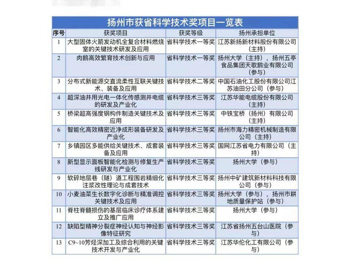 本次省科学技术奖评选,扬州市江苏新扬新材料股份有限公司和扬州大学分别作为第一完成单位摘得一等奖,江苏华能电缆股份有限公司、中铁宝桥(扬州)有限公司、扬州市海力精密机械有限公司、国网江苏省电力有限公司4家企业也分别作为第一完成单位获得三等奖。从承担单位看,13个项目中,企业主持和参与的项目达9个,充分反映了扬州企业技术创新主体地位不断凸显,科技成果转化率逐步提高;从获奖领域看,这些项目集中在航空航天、现代农业、新能源、新材料、高端装备、医疗健康等该市重点发展方向,表明了扬州创新力量驱动优势产业,极大提高了科技进步对经济发展的贡献度。