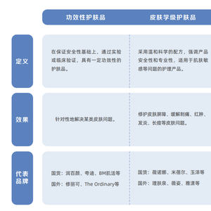 功能性护肤品,大致分为功效性护肤品、皮肤学级护肤品、医用敷料三大类,其中最大占比的功效性护肤品是通过实验或临床验证,具有一定功效并安全的护肤品,皮肤学级护肤品是适用于肌肤敏感等问题的护理产品,而医用敷料是属于医疗器械范畴。