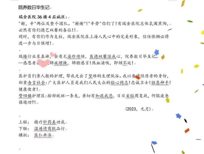 他在感谢信中写道:“瑞金医院医护人员亲人般的护理,帮我走出了艰难的人生低谷。我要以普通经历者的身份,向社会告知:广大医护人员是我们大众的驱患神手!健康使者!生命卫士!”