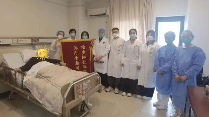 出院前,严老先生制作了锦旗,分别送到周敏和毛恩强主任团队手里。他说,在瑞金医院治疗的这两个星期,他有两个难忘。“第一个难忘是医护人员的脚步,他们永远那么快,那么急,真是分秒必争;第二个难忘,是病房里医生和护士的咳嗽声,他们也是病人,却在照顾病情更严重的我们,听到他们的咳嗽,我的心里也非常难受,真希望我能替他们咳几下。”