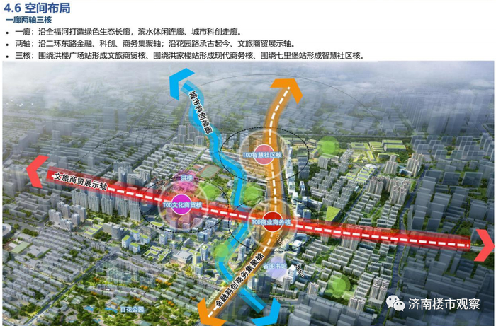 两轴,沿着二环东路打造金融、科创、商务聚集轴;沿着花园东路打造文化商贸展示轴;