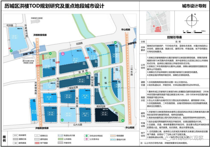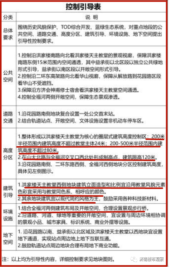 周围要实施严格的限高,以洪楼广场天主教堂位核心区,周围200米范围内限高24米,200-500米范围内限高80米。山大北路与全福河交汇处将形成制高点,建筑限高120米。