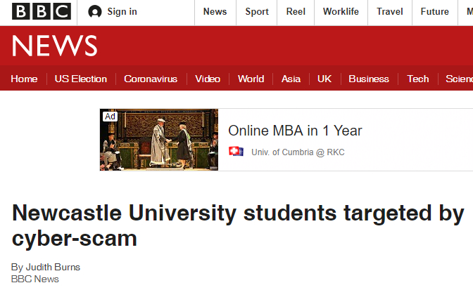 早前,BBC就报道过有诈骗团伙企图通过“像素级伪造”纽卡斯尔大学(Newcastle University)官网,来骗取申请者的高额学费以及个人信用卡信息。
