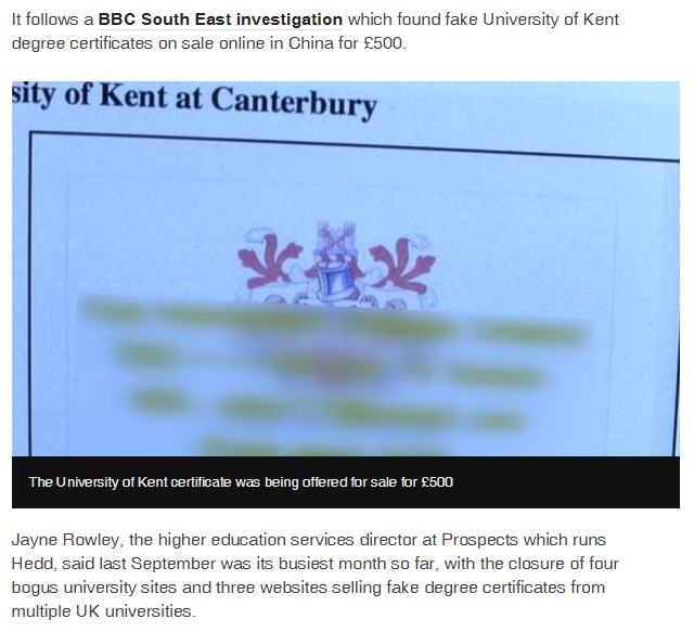 更有甚者,将一些名牌大学的假学位证在eBay卖得风生水起。肯特大学的假证在中国被炒到了500英镑!可见假证在市场上的买家并不在少数。