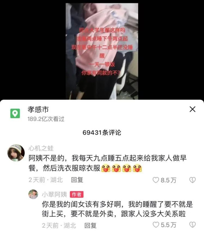 一位家长@小翠阿姨 在短视频上晒出了孩子的假期生活,分享孩子每天凌晨两点睡、只吃一顿饭的日常,并且感慨“现在大学生在家都这样吗”。于是,评论区就展开了一场“不怀好意”的行动:
