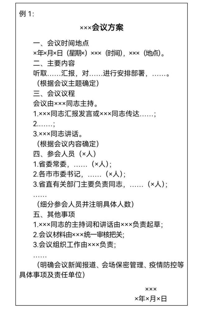 在摸清基本情况的基础上起草会议方案,其要素包括会议时间、举办地点、主要内容、会议议程、参会范围、其他事项等(见例1)。