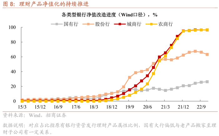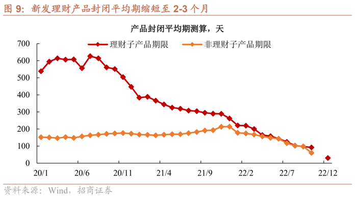 另一方面,摊余成本法产品短期虽能稳住理财规模,但是中期债市波动率抬升,贡献可能低于预期。11月经历净值大幅波动和赎回压力后,12月多家理财子等积极推出摊余成本法估值产品。从发行数据来看,2022年新发理财产品中,封闭型占比85.4%,12月读数明显走高。短期视角来看,新产品的发行从增量资金角度稳定负债端,二永债抛压暂止,债市开启阶段性修复行情。然而,从中长期视角而言,摊余成本法产品约束众多,难以大规模上量;并且,因其流动性和收益性均弱于净值型产品,对投资者而言性价比并不高。因此,摊余成本法产品的密集发行仅是在特殊时期应对市场利率波动的一种策略,再一次成为市场主流的难度不小,而随着投资者教育增强以及银行资管体系的完善(针对风险偏好不同的投资者设计差异化产品),摊余成本法产品的贡献或许也较为有限。