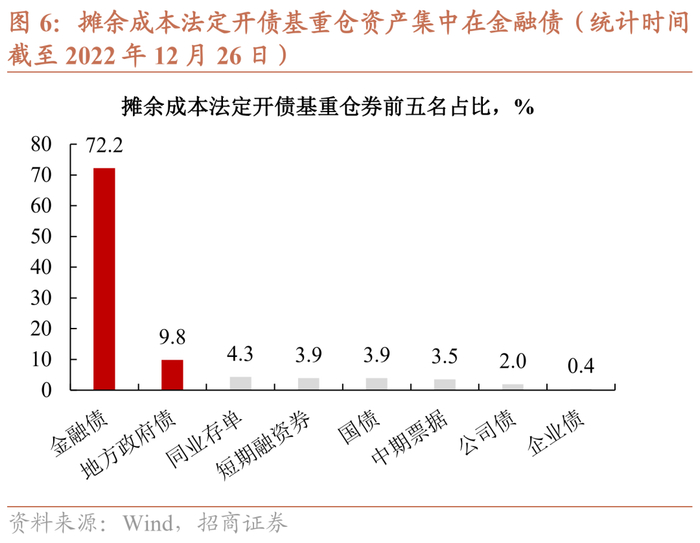 目前,摊余成本法定开债基重仓资产集中在金融债,尤其是政金债。我们筛选摊余成本法定开型债基,截至2022年三季报数据,重仓券中金融债及地方政府债合计占比约为82%,其中,政金债配置占比最高,随后是普通商金债。