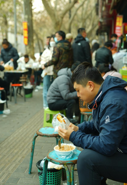 西安人的早餐里一定会有一碗油茶,泡着麻花蹲在路边喝的那种。在南门早市上,随处可见坐在小凳子上,蹲在路边,站在墙角的人们。手里拿着一块肉夹馍,端上一碗胡辣汤,他们可能是早餐后公园下棋的大爷,也有吃完跑去赶地铁的都市青年,也有开着豪车停在路边的老板。
