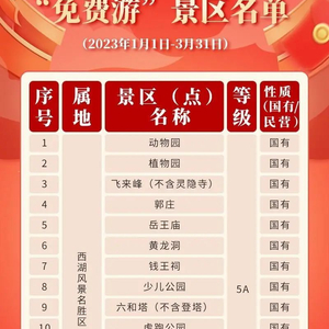 2023年元旦起到3月31日,杭州旅游对全市41个景区和9个佛道宗教场所推出免费游政策。其中包括西湖景区、西溪湿地、良渚遗址公园、千岛湖、大明山、天目山、黄公望隐居地、瑶琳仙境、七里扬帆等知名景点。