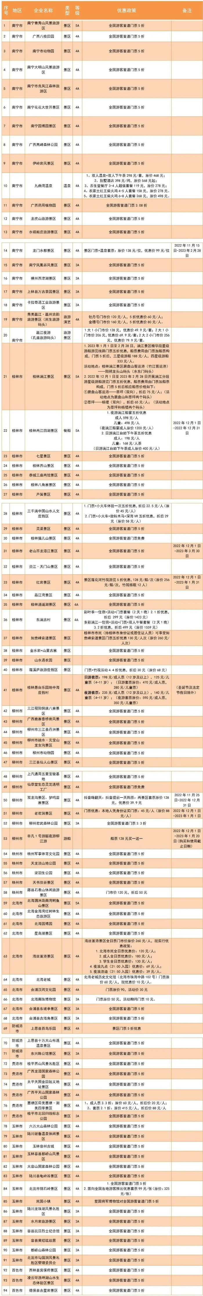 2022年12月1日至2023年2月28日,广西以下文旅企业对全国游客实行首道门票5折优惠政策(法定节假日除外)。另有备注的按备注执行优惠措施。