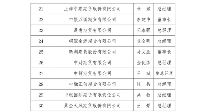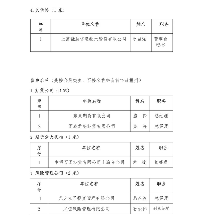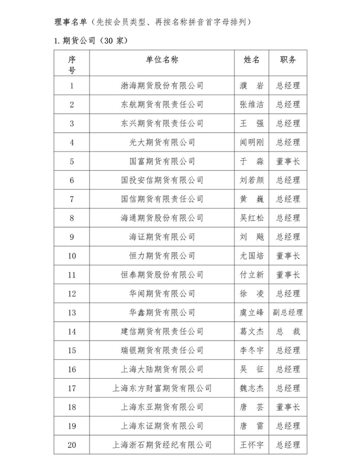 在第七届理事会、监事会第一次会议上,选举新湖期货董事长马文胜为公会第七届会长,选举国泰君安期货总经理姜涛为公会第七届监事长,选举申银万国期货董事长李建中等14名理事为公会第七届副会长,选举东吴期货总经理施伟为公会第七届副监事长,继续聘任金文为公会第七届秘书长,黄媛为公会第七届副秘书长。