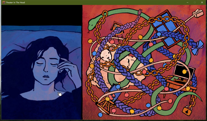 尽管工作室两款游戏的题材和体量各不相同,但在元叙事主题上却是共通的,同时都具备时间循环(ループもの)与叙事套层混乱的设计风格。就如邓剑对《完美的一天》的游戏批评一般,失眠的体验感是绵延不绝、轮回出现的,失眠的原因和症状随着脑内剧场的展开而被勾勒出来。《失眠》的最后一幕也设计了如《完美的一天》一般的三重次元的关系,在整个游戏过程中 “我”与幻想朋友对话以及演出的过程,都变成了“我”的美术设计的一幅画,并从一个失眠话题的共鸣变成了元游戏的一部分,乃至可以认为这是设计《失眠》游戏的过程。[2]