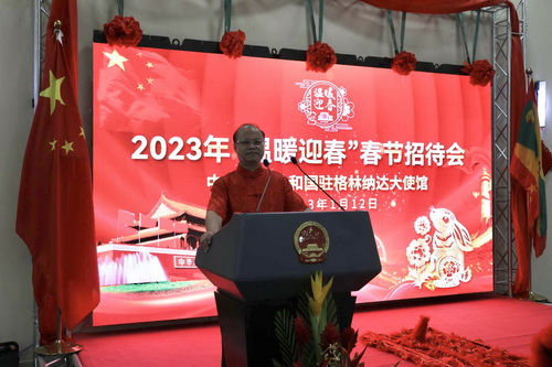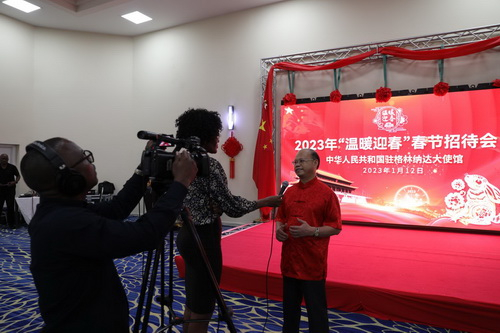 2023年1月12日,驻格林纳达使馆在格首都圣乔治丽笙酒店举办2023年“温暖迎春”春节招待会,驻格林纳达大使韦宏添及使馆全体人员、格林纳达华侨华人联谊会会长黄跃忠、格中友协主席路易森、在格侨胞、中资机构、孔子学院、留学生代表等约百人出席。格国家电视台在现场进行了采访报道。
