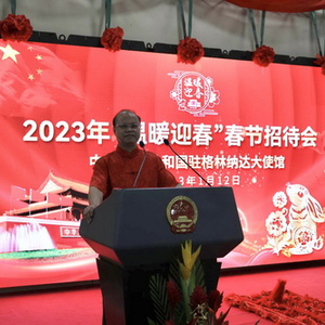韦宏添大使在致辞中代表使馆向全体出席人员致以新春祝福,介绍了中国式现代化、过去一年中国取得的经济发展成就、外交领域新的突破等。韦大使指出,2022年是不平凡、不寻常、在中华民族历史上值得铭记的一年。中国共产党二十大胜利召开,描绘了全面建设社会主义现代化国家的宏伟蓝图,明确提出以中国式现代化全面推进中华民族伟大复兴的使命任务。我们攻坚克难,统筹国内国际两个大局,统筹疫情防控和经济社会发展,统筹发展和安全,保持了经济社会大局稳定。我们高举推动构建人类命运共同体旗帜,坚持真正的多边主义,大力弘扬全人类共同价值,推动落实全球发展倡议,提出全球安全倡议,努力为人类和平与发展事业贡献中国智慧、中国方案。