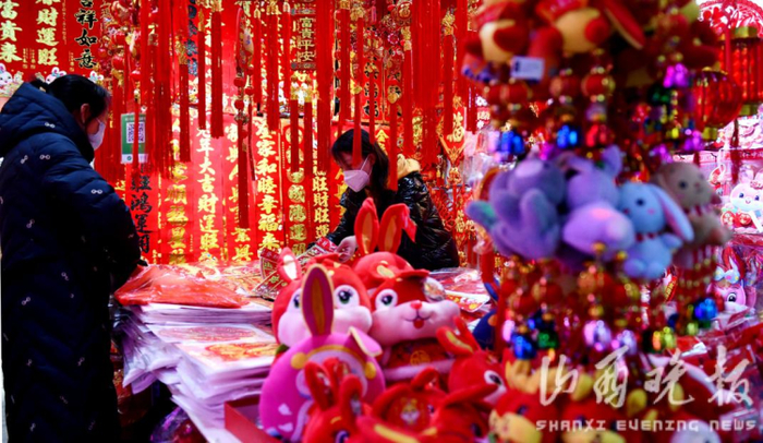 最近街头最具年味的,当属红灿灿的新年装饰:对联、福字、年鱼儿挂饰、兔子年画……看着就有过年的热闹劲儿。