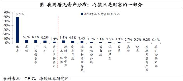 存款只是居民财富配置中的一部分,而且是不太高的一部分,如果居民的财富结构发生比较大的变化,例如从其它资产类别向存款“迁徙”,那么即使居民财富和储蓄没有增加的情况下,存款也会出现高增长。