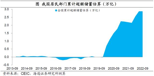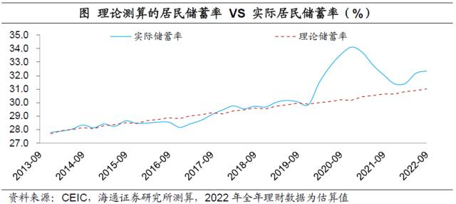 海通宏观根据国家统计局每个季度调查的居民可支配收入和支出数据来测算,在过去三年多的疫情当中,居民实际的储蓄率明显超出理论值。