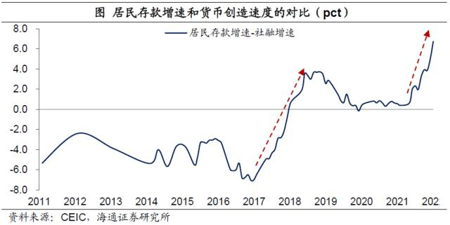 存款高增长,是不是整个社会的货币创造速度加快了呢? 海通宏观用社融增速来代表整个社会货币的创造速度,结果发现,在2017年之前的几年时间里,居民存款增长持续落后于整个社会的货币创造速度;但是从2018年开始,二者的缺口开始快速弥合,尤其是2018、2019两年,弥合速度非常快,居民存款增速从落后于、转为了领先于整个社会的货币创造速度。