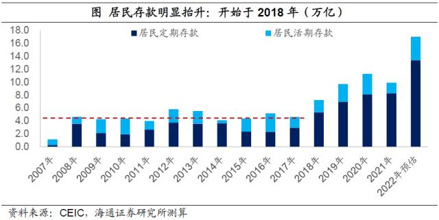 从2018年开始,居民存款就明显高增长,2018年增长7.2万亿,2019年增长9.7万亿,2020年11.3万亿,2021年9.9万亿,2022年预计17.8万亿,都远远高于2018年之前的年度增长规模。