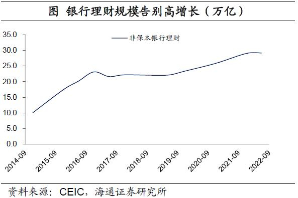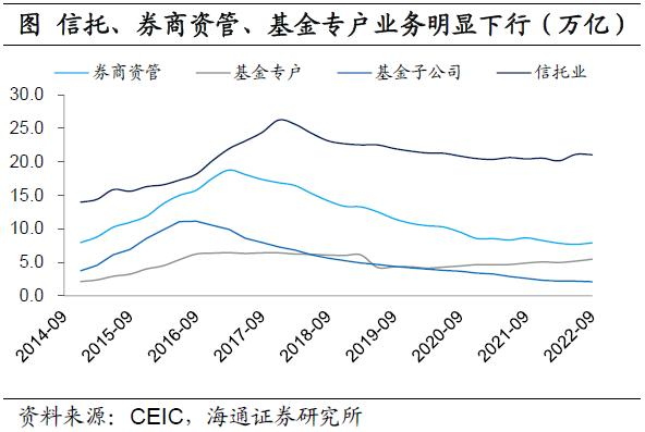 在监管政策不断收紧后,信托、券商资管、基金专户等业务规模从2016年之后出现了趋势性的下降;银行理财也告别了高增长,2015年理财规模增长7.3万亿,2016年增长5.7万亿,但2017-2021年的5年时间里,平均每年只增长1.2万亿。