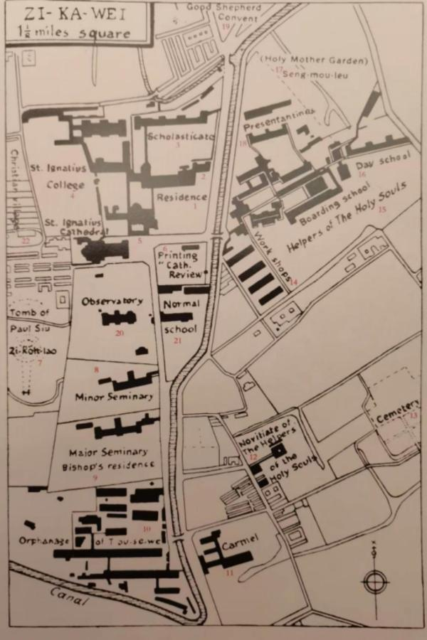 在天主堂、气象博物馆、圣母院旧址这些建筑坐落地长期固定的前提下,我们可以在各种绘制于二十世纪初到八十年代之间的交通地图或教区指南图上,基本框定现在书院的位置,再结合各种专业方志和教区文献记载,以及老照片实证,摸索出一些较为清晰的线索——
