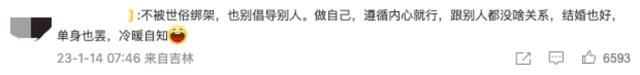 也有网友表示嘴硬,冷暖自知,“不被世俗绑架,也别倡导别人。做自己,遵循内心就行,跟别人都没啥关系,结婚也好,单身也罢,冷暖自知”。