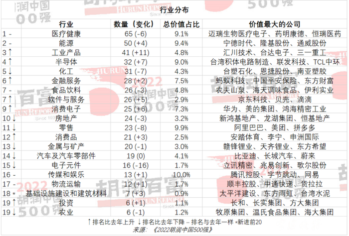 上榜企业的行业分布也佐证这一趋势。2022胡润中国500强分布最集中的前四大行业,花落医疗健康(65家)、能源(50)、工业产品(41)、半导体(32),合计占比近三分之一,均与先进制造业或战略性新兴产业相关,而房地产、零售等传统行业则“遇冷”。
